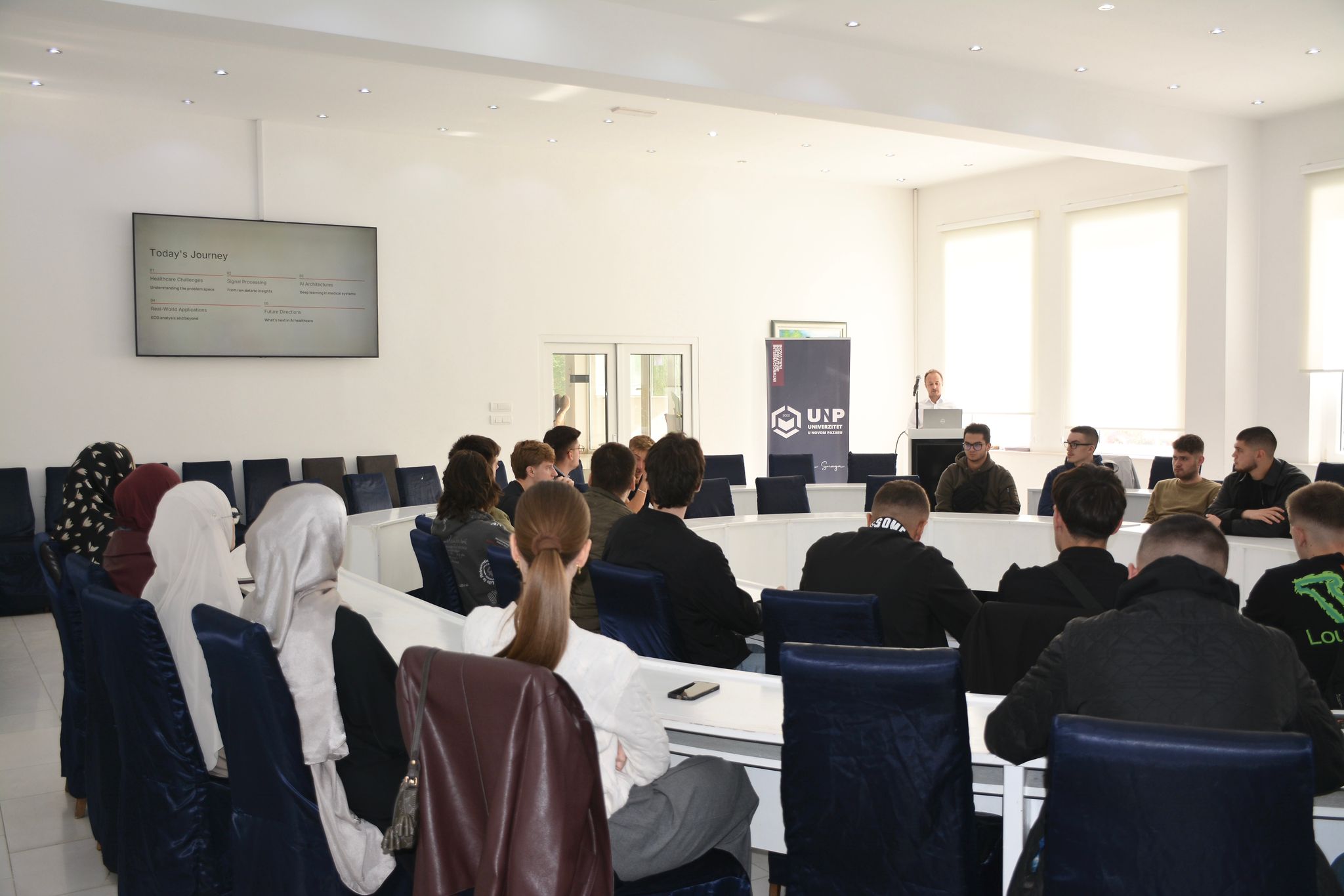 Na Univerzitetu u Novom Pazaru u organizaciji Departmana za ekonomske i računarske nauke održano predavanje Bilgina Demira sa International Balkan University iz Skoplja, koji je studentima predstavio temu „AI in Healthcare: From Signals to Smart Decisions“.